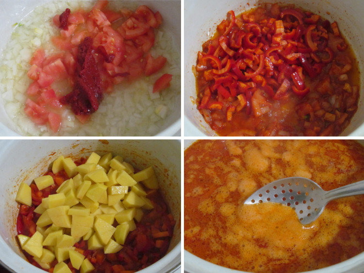 В кастрюле разогреть растительное масло, выложить лук и обжарить пару минут на сильном огне. Добавить морковь и обжарить минуту, следом добавить перец и обжарить еще минуту. Далее добавить помидор и томатную пасту, перемешать, посолить и приправить кориандром по вкусу. Обжарить еще пару минут, после чего выложить картофель, перемешать и влить 1,5 л. холодной воды. Довести суп до кипения, снимая образовавшуюся пенку.