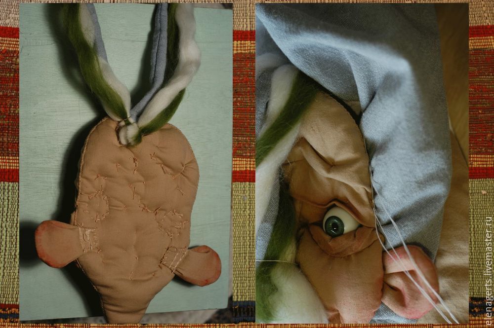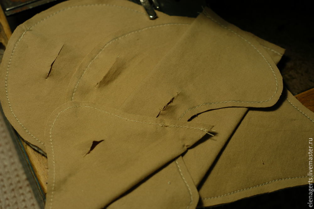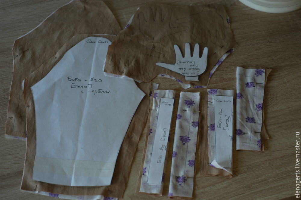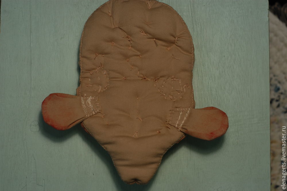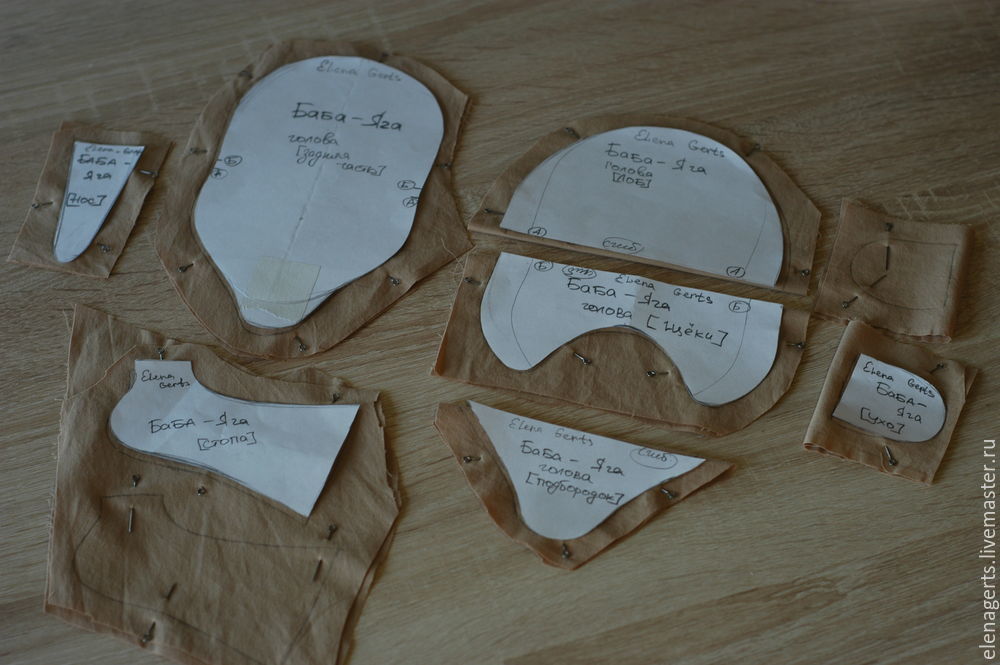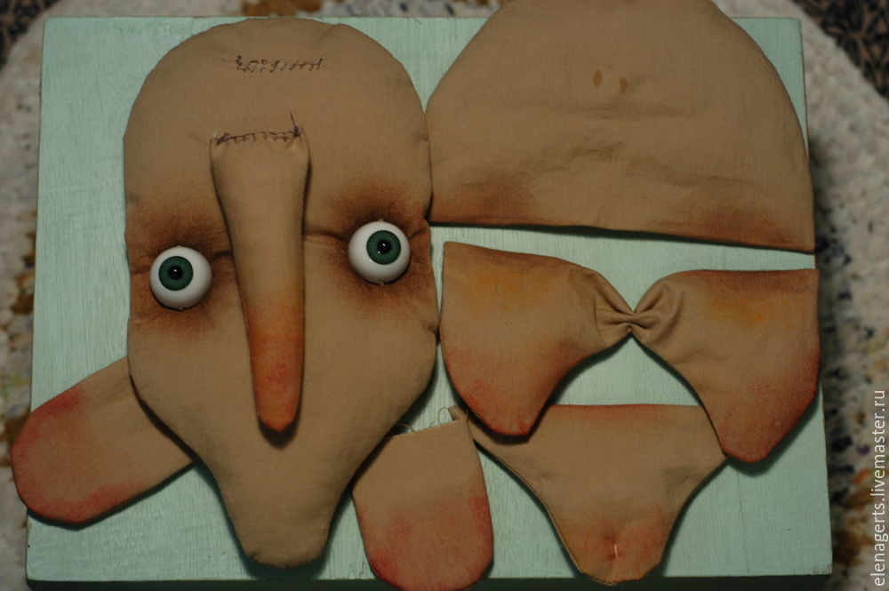 У деталей (голова, лоб, щёки, подбородок) делаем небольшой надрез и выворачиваем, так же выворачиваем на изнанку все оставшиеся детали. У деталей тело с горбом надрез делаем со стороны ситцевой ткани в рисунок!