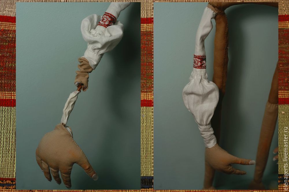 Надеваем рукава на руки. Потом соединяем деталь ладонь с рукой и обматываем место соединения.