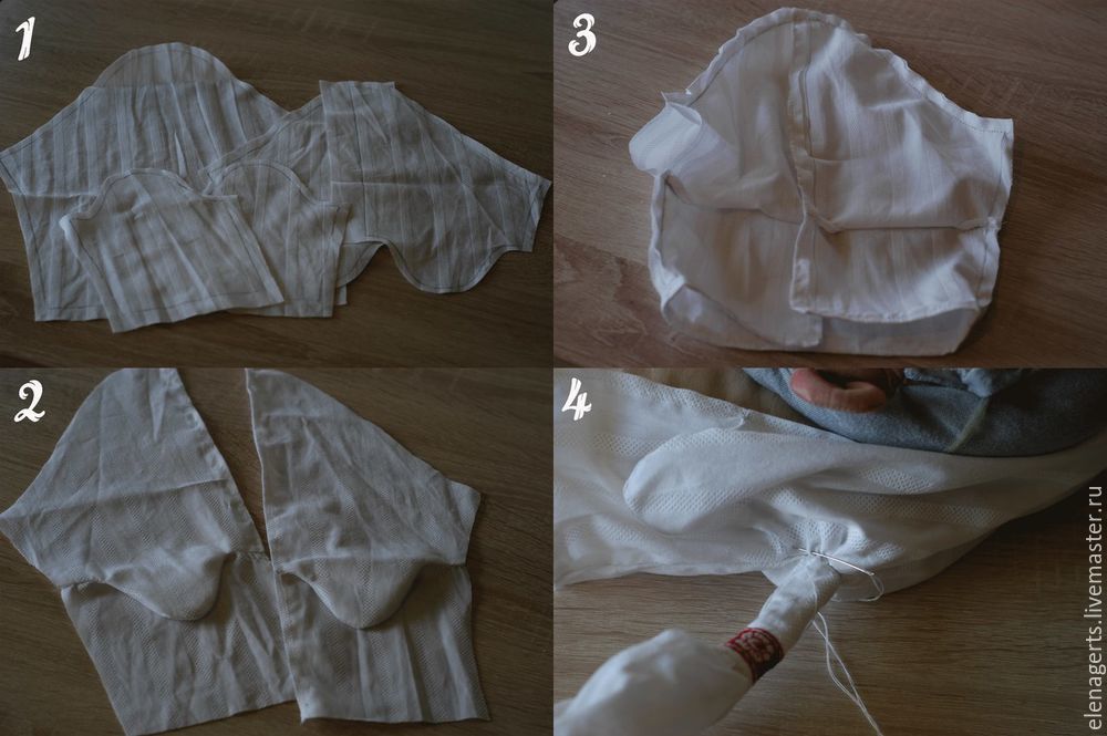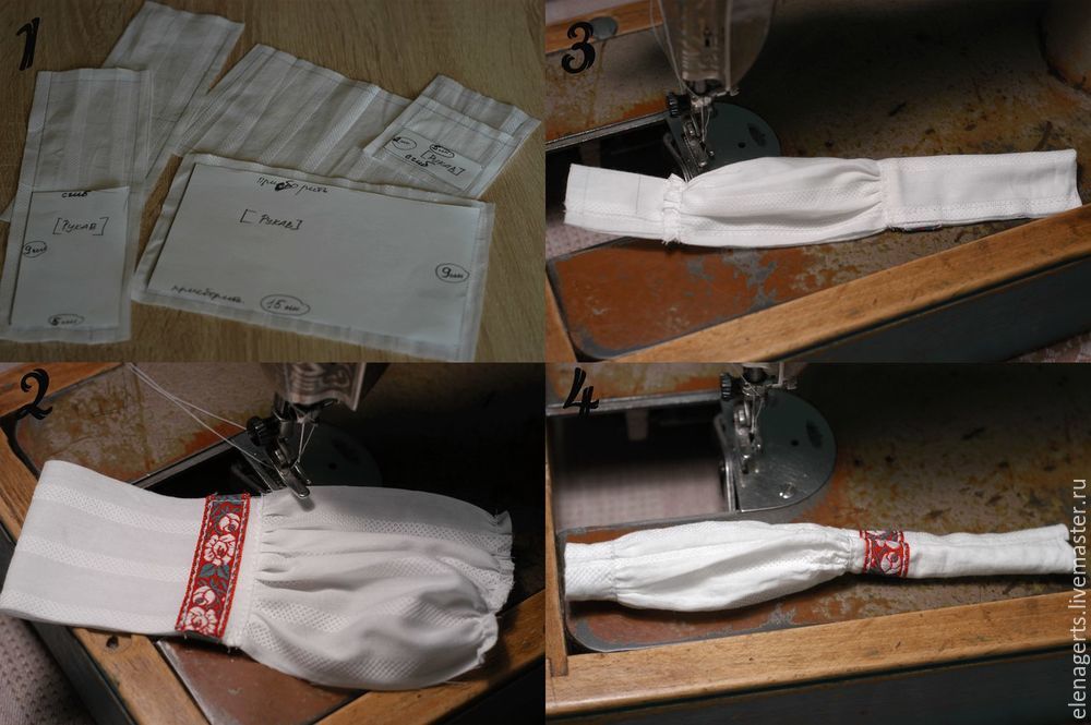 Сшиваем детали как на фото, надеваем на куклу рубашку, присбариваем и пришиваем к рукавам.