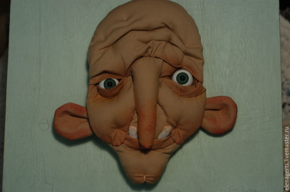 Детали лица подкрашиваем акриловыми красками и масляными пастельными карандашами. Немного утягиваем деталь щёки и подбородок. Потом пришиваем глаза, можно приклеить.