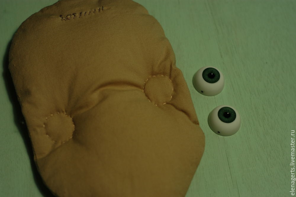 Начинаем с лица Бабули-Ягули. Отмечаем место для глаз и прошиваем насквозь (у меня пластиковые глаза — зелёнго цвета, у вас могут быть другие).