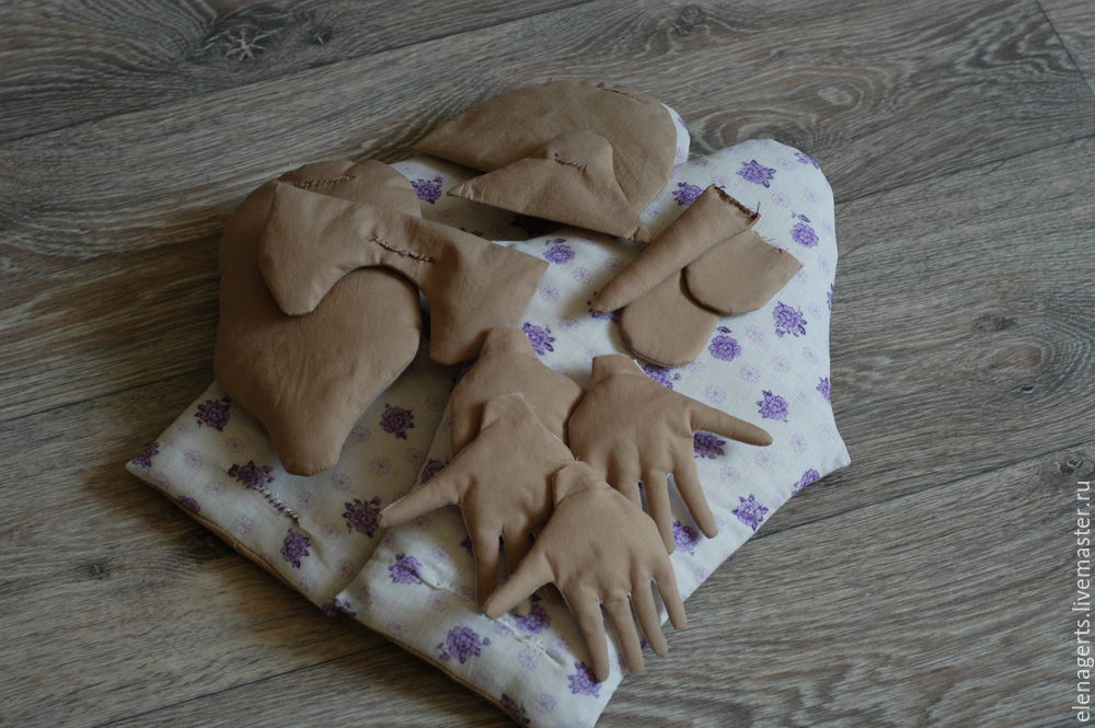 Набиваем детали наполнителем (у меня холофайбер), ладони — набиваем совсем немного, особенно в пальцах (иначе тяжело будет сшивать пальцы), не набиваем наполнителем (стопы, ноги, руки), зашиваем надрезы, через которые набивали детали и хорошо проутюживаем все детали.