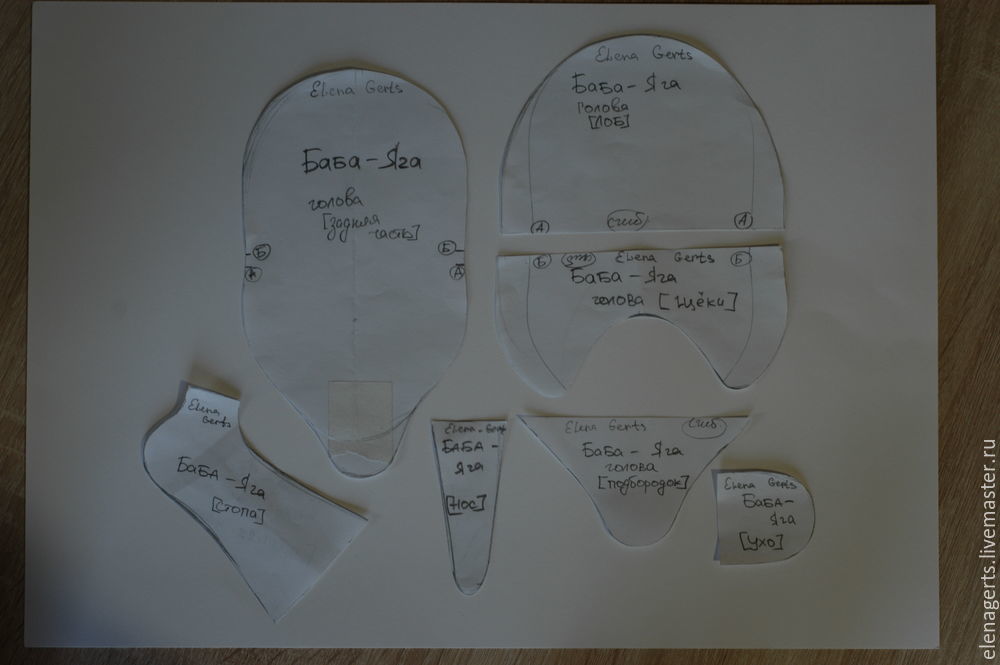 Переносим выкройки на ткань телесного цвета (моя ткань немного стрейчевая — впервые с такой работаю), выкройки головы (голова, лоб — со сгибом, щёки — со сгибом, подбородок — со сгибом, уши — две детали, нос) и стопа — 2 детали, соединяем с такой же тканью телесного цвета, закрепляем иголками и прошиваем по контуру.