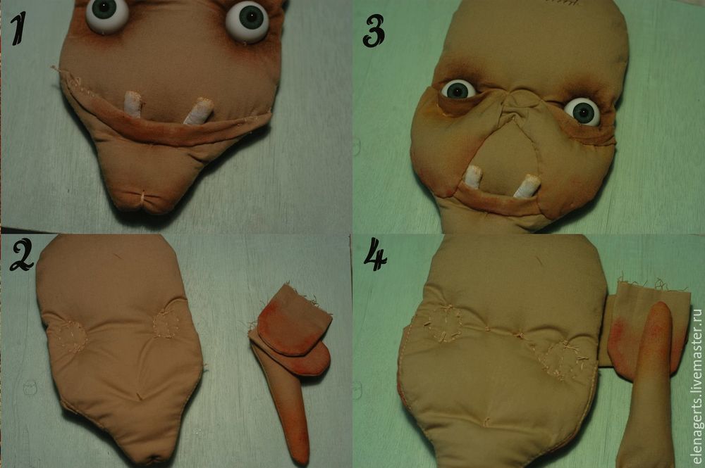 Теперь сшиваем детали друг с другом. Начинаем с подбородка и заканчиваем лбом. Сразу утягиваем в тех местах, где вы считаете нужным, можно сделать любое выражения лица. Подбородок — зубы шьём из ткани белого цвета и подкрашиваем акриловыми красками. Подбородок утянуть нитками. Потом пришиваем щёки, утягиваем и зашиваем около глаз.