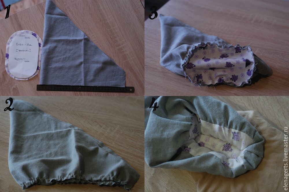 Для волос можете выбрать ткань на ваше усмотрение (я взяла серую ткань). Вырезать треугольник со срезанным концом на одной стороне, мой размер в сложеном виде 28 на 30 см. Присборить с одной стороны, соединяем с деталью из ситца в рисунок и прошиваем. Деталь выворачиваем, набиваем немного наполнителем и прошиваем вручную волосы из ткани к телу с горбом насквозь.
