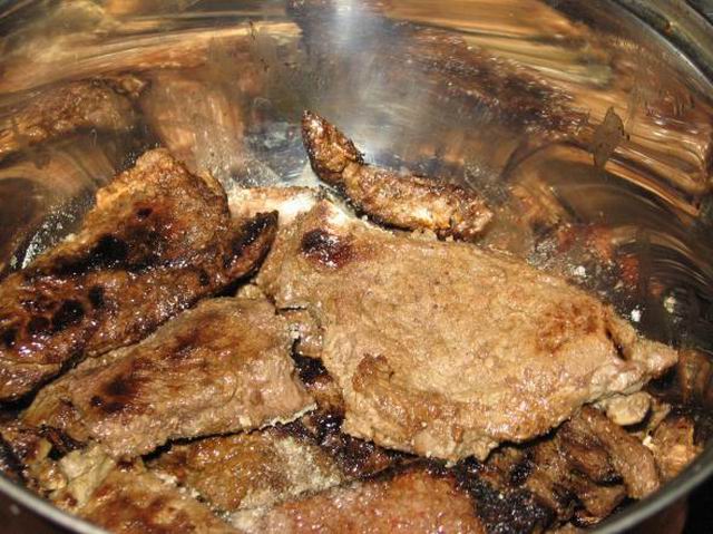 Ожаренное мясо складываем в кастрюльку.