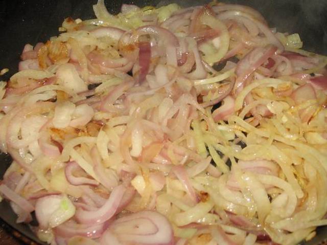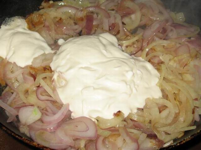 Готовим лук. Лук нарезать кольцами или полукольцами (как получится), пассеровать.В обжаренный лук добавляем сметану и муку, хорошо перемешиваем.