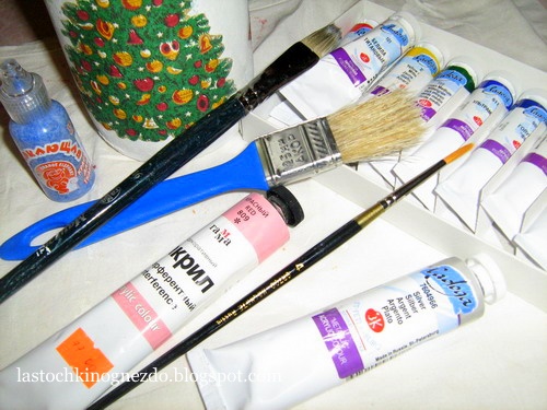 5) Приготовьте акриловые краски! Я пользовалась красками Decola и Ладога. Нормальные и те, и другие. Вот фото кисточек: