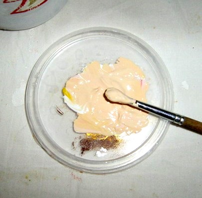 Затем придумываем каким у нас будет основной фон бутылки. Мне захотелось бежево-розовый (ассоциация с ангелами и последующим золотым покрытием). Смешала белую, желтую и красную краску на крышке от сметаны получилось примерно вот так.
