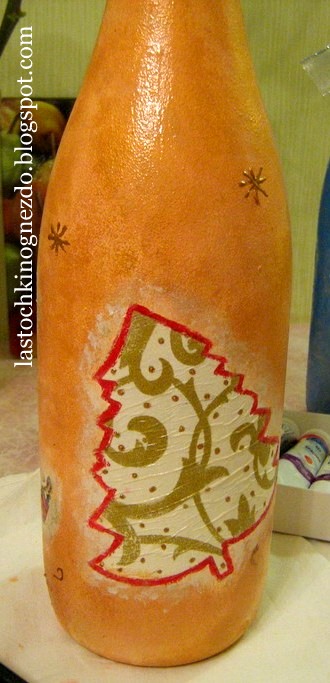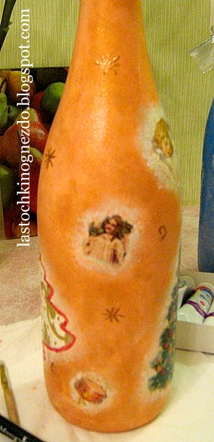 В прошлом году я понаделала море таких бутылок: друзьям, родственникам, воспитателям в д/саду и т.д. и т.п. Несмотря на отсутствие мастерства в этом деле, все мои бутылочки разошлись на ура и каждый жалел их использовать по назначению. У некоторых так и стоят;)))