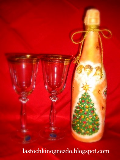 Приближаются новогодние праздники, как я поняла, вы уже составляете списки поздравляемых;))), а вот что подарить такого-эдакого еще не всем придумали. Пинкипами и игольницами обеспечены уже все подруги, на стенах родственников не осталось свободного места от картин, шейки близких увиты креативными шарфами и бактусами. Чего бы еще? Просто пойти в магазин и купить подарок для рукодельницы ниже своего достоинства, нужно обязательно сделать что-то своими руками и вложить туда частичку своего тепла. А давайте задекупажируем бутылку шампанского!