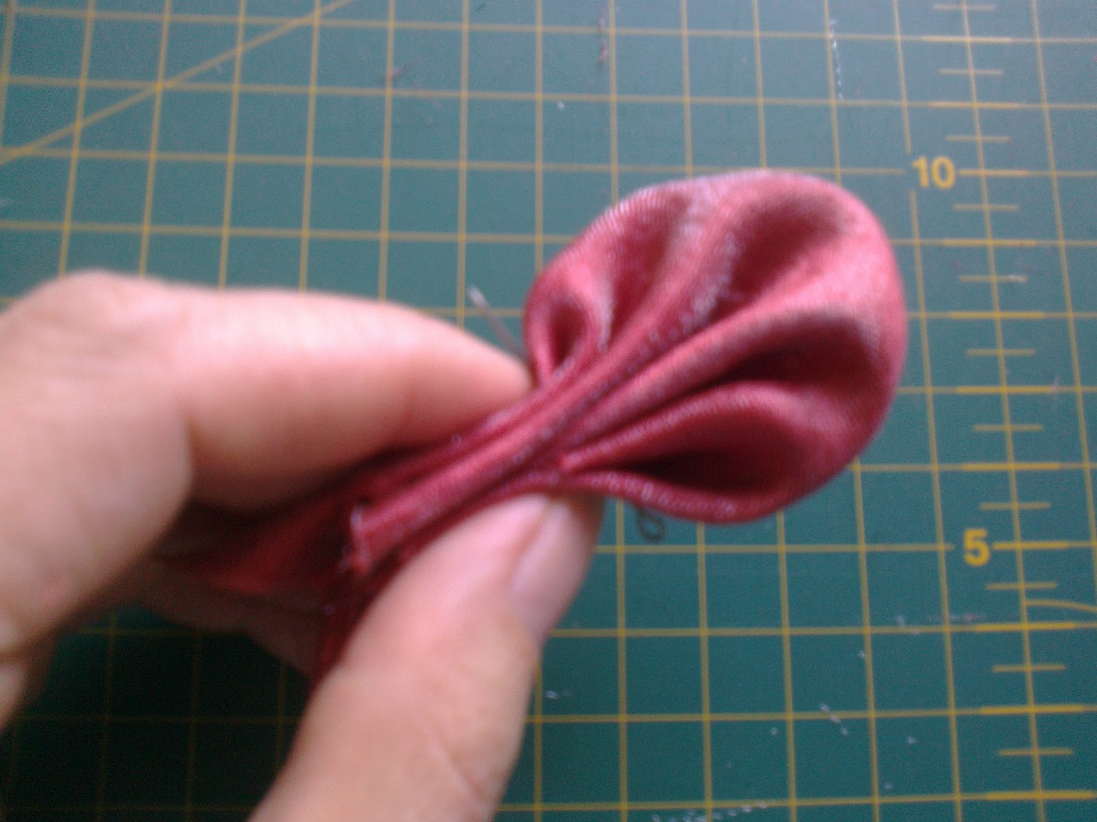 10. Прежде чем стянуть эти 3 лепестка вставляю в середину между ними сложенные вдвое тычинки. Их можно купить в магазине, где продают фурнитуру для оформления букетов.