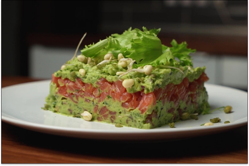 На тарелку (можно использовать форму или без нее) уложите часть смеси с авокадо, затем лосось и снова авокадо. Уберите в холодильник на 30 минут.