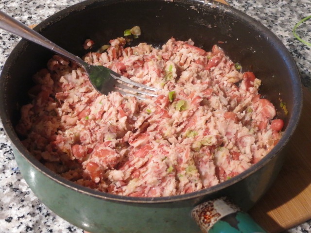 Добавляем к фасолевому пюре нарезанный зеленый лук, зелень, чабер, черный и красный перец. Солим по вкусу, перемешиваем.