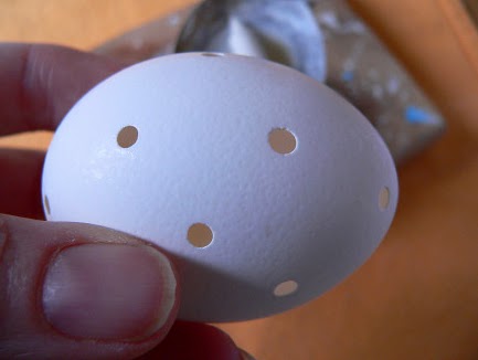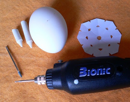2. Дырочки просверлим маленькой дрелью для рукоделия (13 тыс оборотов и два сверла). При этом скорлупку крепко держать в ладони, сверлом сильно не нажимать.