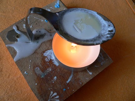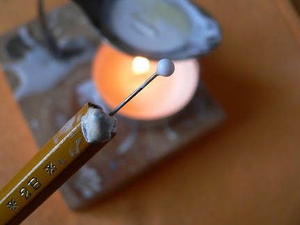 нанесения орнамента воском иглу с металлической головкой воткнем в обратную сторону карандаша. При работе положить возле себя лист бумаги, на котором предварительно попробовать линию и состояние воска. При положенной температуре воск при нанесении образует слезинку.