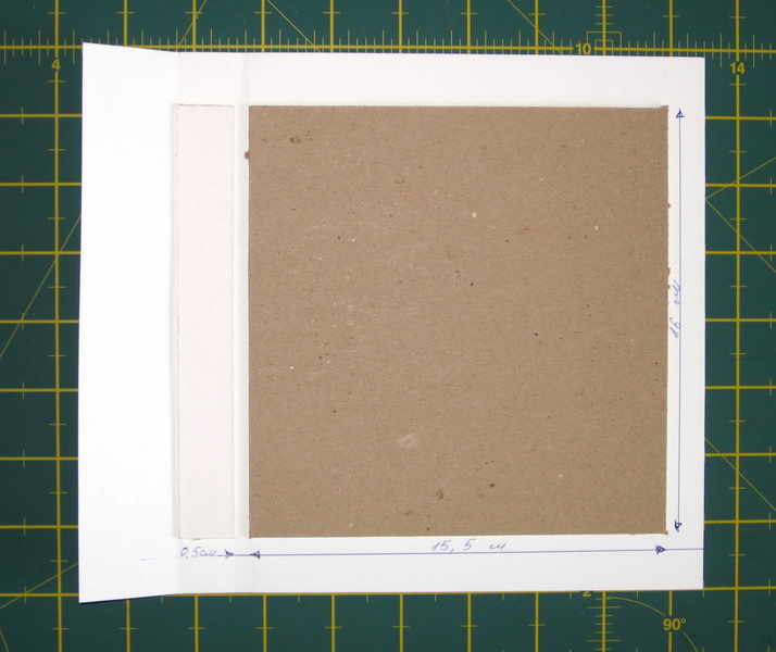 Теперь займемся обложкой альбома. Верх обложки. Раскладываем на скрап-бумаге полоску из картона 2х16 см, затем на расстоянии 0,5 см прямоугольник, по горизонтали 15,5 см, по вертикали 16 см. С помощью двустороннего скотча закрепляем бумагу на картоне.
