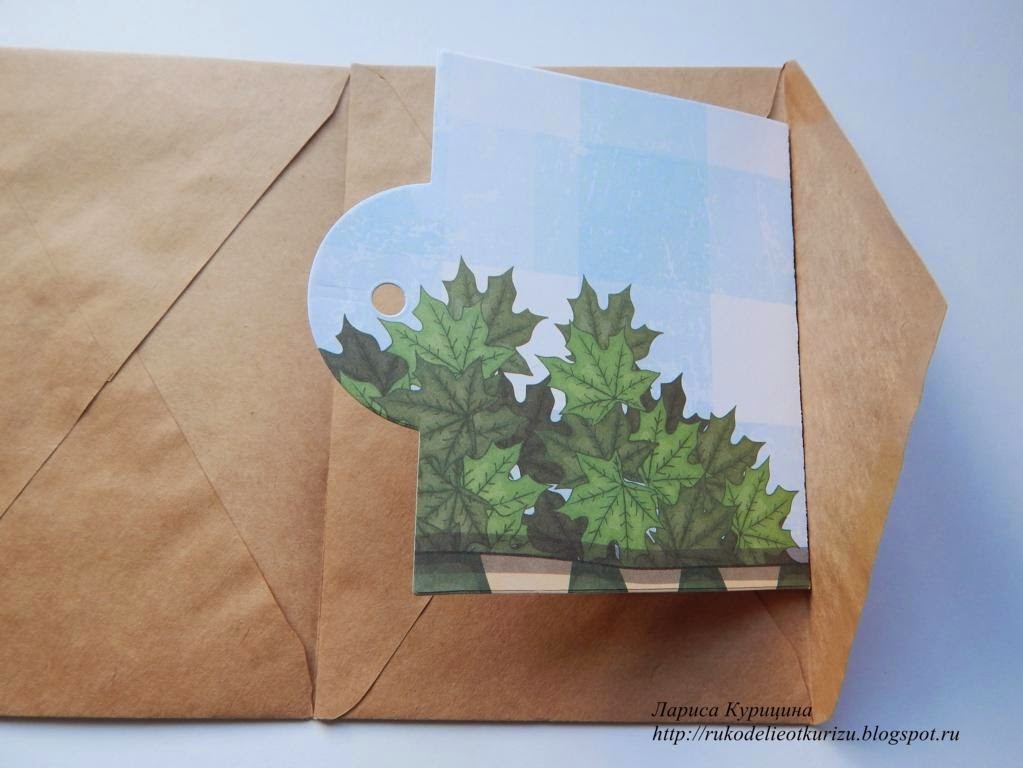 3. Один большой тег приклеиваем между конвертами. Сгибаем его так, что бы одна часть была на 5 мм меньше ширины конверта. Два оставшихся больших тега приклеиваем в конструкцию из конвертов. Декорируем свободный угол конверта.