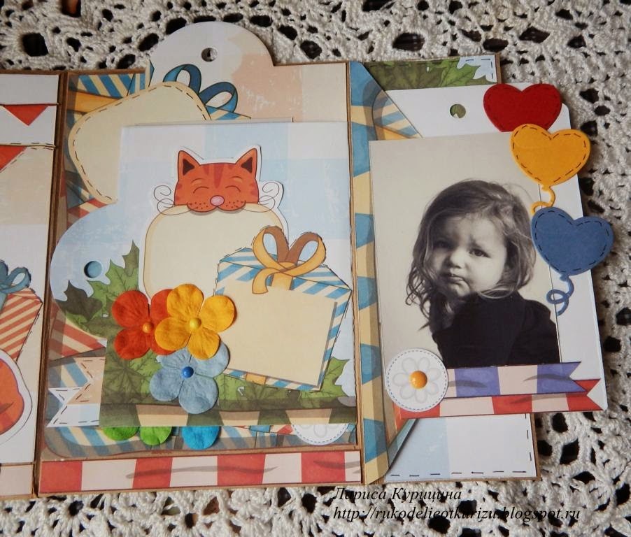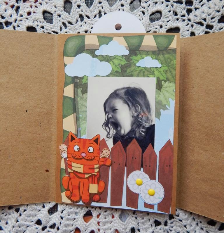 Внутри странички хорошо декорировать в американском стиле, бумага с котом как раз очень для этого подходит. Для маленького формата альбома обычно достаточно наклеить фон, подложку для фото (по желанию) и далее декорировать тегами и декором из этой же коллекции + использовать цветочки, брадсы, дотсы, вырубку из обрезков бумаги этой же коллекции или из кардстока...
