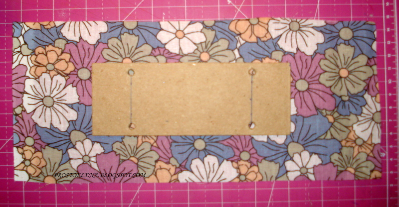 9). Оборачиваю обложку тканью. Беру вторую картонку для укрепления наружного корешка и просто приклеиваю ее на клей, а затем прошиваю по контуру.