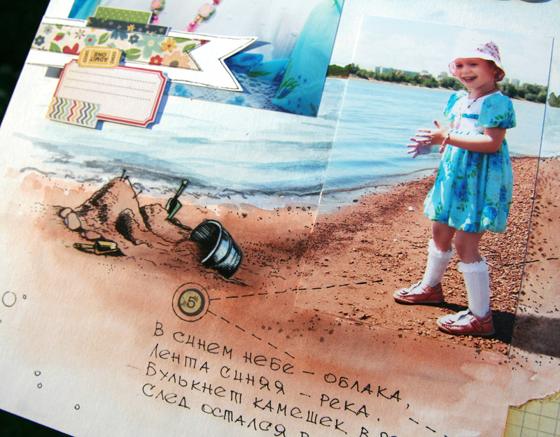 Реку и песок я дорисовала, также дорисовала панамку и немного зеленоватый фон для большого фото, страницу после высыхания прогладила утюгом. Теперь можно приступать к декорированию.