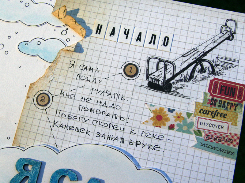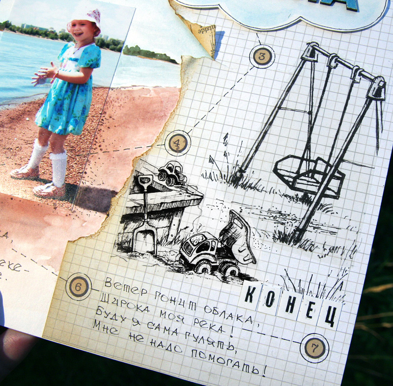 Как это совместить с рекой? Очень просто – надо разделить страницу на две части – одна про реку, другая про детскую площадку. Второй этап – раскладываем все на страничке и смотрим, что примерно получается. Все было хорошо за исключением того, что элементы на странице были разрозненные – часть с рекой получалась нормально, а часть со штампами качелей – непонятно как. Надо было их чем-то объединять в единую композицию. Так возникла идея – надо написать журналинг. В качестве журналинга, после недолгих экспериментов, написалось простое детское стихотворение из трех четверостиший, которых хватало как раз на то, чтобы закрыть пустые места. Ну, и в довершение – пришла идея сделать из странички «игровое поле» с номерами ходов, чтобы связать обе части страницы.