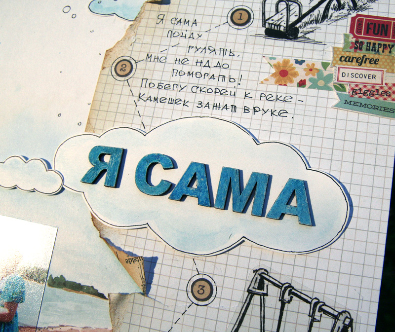 Из предложенных фотографий я выбрала две – первую (главную), на которой по выражению лица и так понятно, что она «сама», а вторая – на фоне речки, передающая движение и подтверждающая любовь девочки к реке. Была еще одна фотография, на которой она камешки бросала в реку – но она была уже лишней. Итак, сюжет, соответственно, про гуляние. И про то, что «она сама»… и очень хотелось приспособить мои штампы из серии «Город детства» с разными качелями и песочницей.