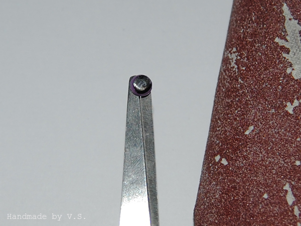 Зашкуриваем его шляпку наждачной бумагой, оставляя цветные края (если оттенок брадса вообще нам не подходит, можно зашкурить его полностью).