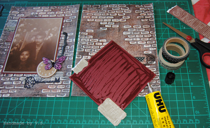 Берём наши фоны с кирпичиками и прикладываем к ним подготовленные фото на подложках (и примерный декор можно приложить))) Так мы попытаемся определить, где будет располагаться штампинг.