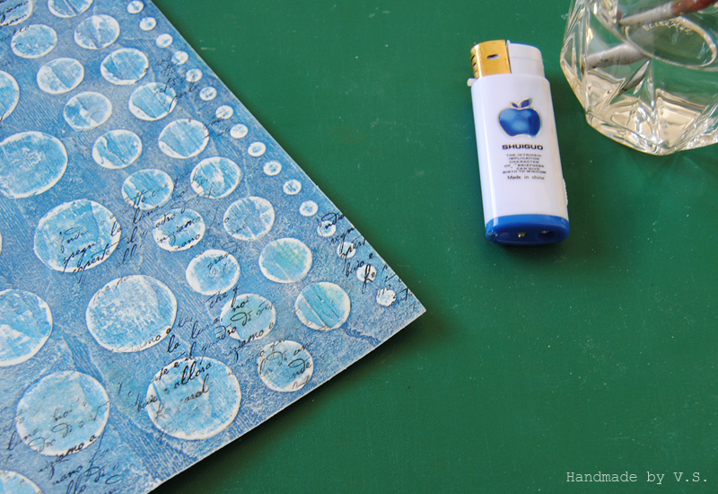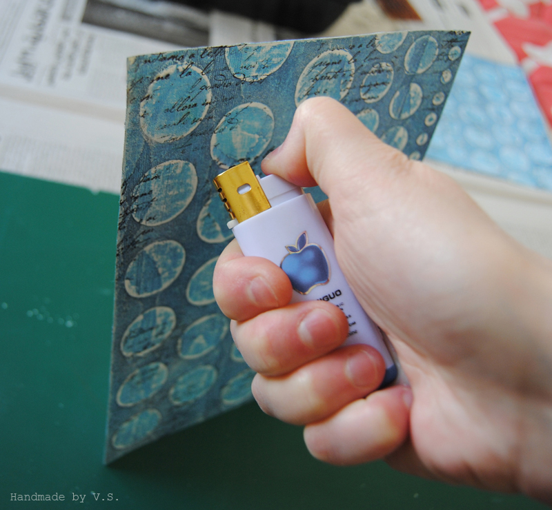 Держа зажигалку перпендикулярно поверхности листа (я пользуюсь двумя руками - в левой держу лист, в правой зажигалку), водим пламенем по кружочку и запекаем пудру. Не палим лист )) если надо, даём ему чуть остыть и снова запекаем пудру, пока она не расплавится вся.
