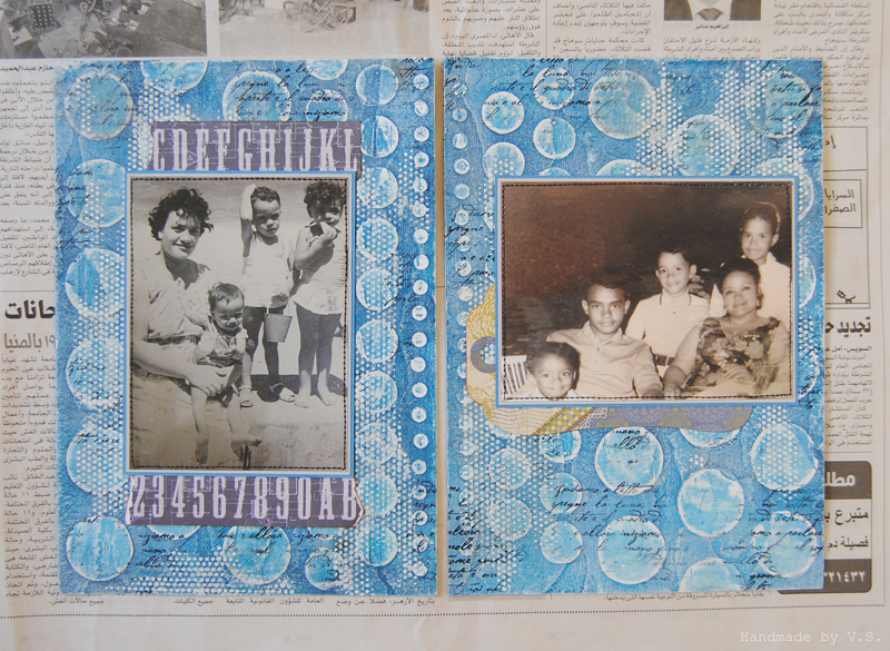 На левой страничке обрамляю фото снизу и сверху оборванными кусочками темно-синего бордюра с буквами алфавита, а на правой подкладываю под фото готовый тэг схожего оттенка синего.