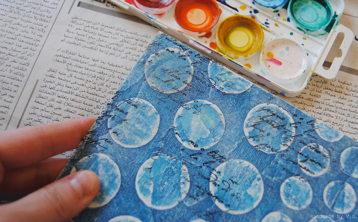 Берём наши фоны с крупными кругами, чернила "Стазон" и штамп "рукописный текст". Штампуем без акрилового блока, с уходом текста в никуда.