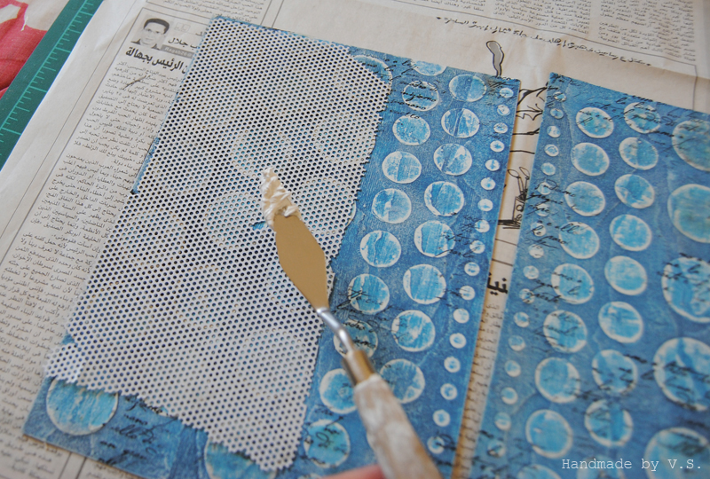 Прикладываем трафарет к нашему фону, набираем пасту (у меня опять самодельная) на мастихин и редкими узкими вертикальными мазками наносим пасту на странички.