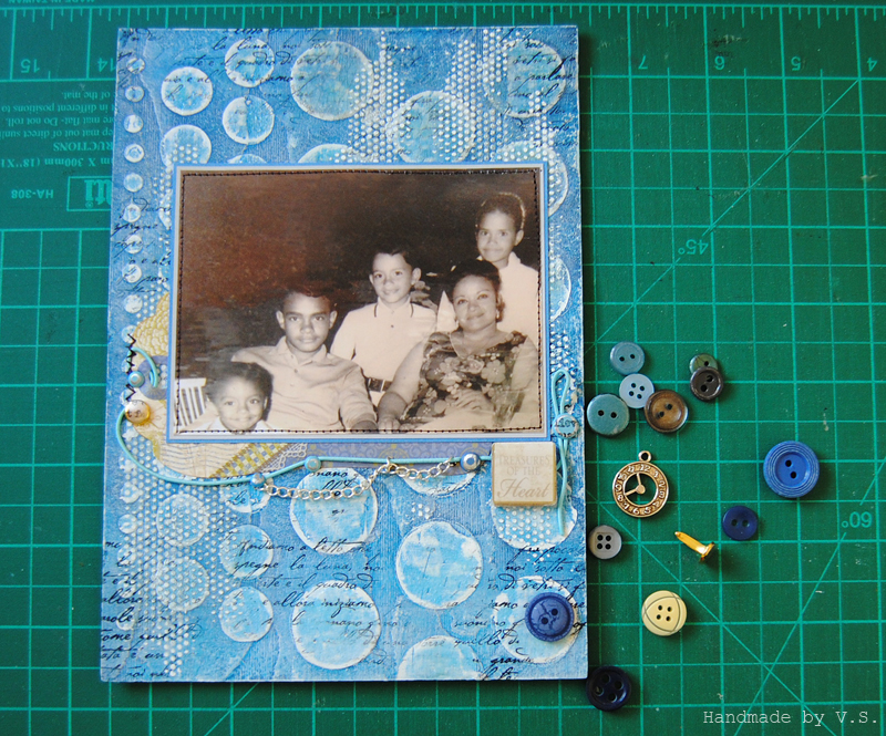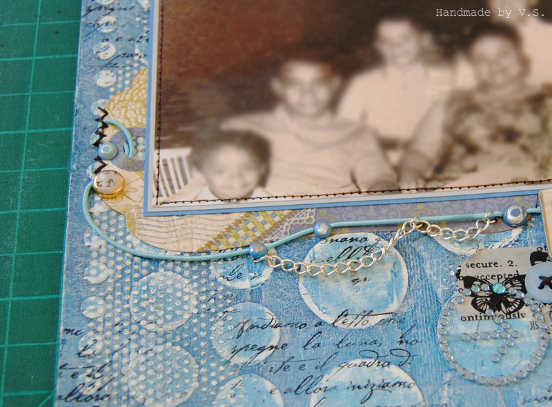Дальше я высыпаю всевозможные пуговицы сине-голубых оттенков, мелкие брадсики, серебристые шармики и цепочки... и пытаюсь собрать всё это в единую композицию. Бежево-зеленоватые цвета на тэге под фото подсказывают мне цветовую гамму других элементов декора, и я применяю акриловое стёклышко с текстом как основной элемент правой странички.