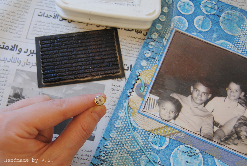 Ну и основной декор правой странички: фишка с акриловым стёклышком, два кусочка принтованного скотча, шармик-часики на "шнурочке" из стежков, голубая пуговка, брадс голубой отштампованный, сложный брадс с домиком и стрелочка в кружочке из