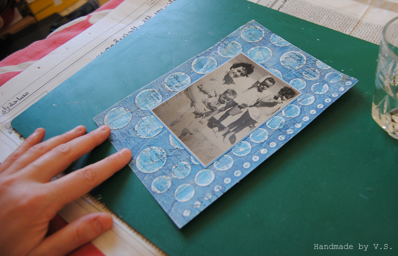 Под фото на вощёном шнуре, придерживаемом голубыми и синими брадсиками, я закрепила цепочку. Прикольно )))