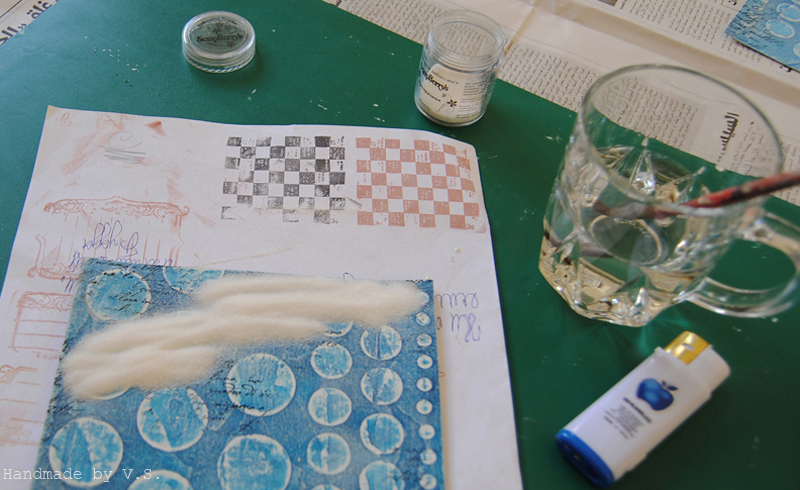 Нам понадобится вода, маленькая кисточка, прозрачная пудра для эмбоссинга и зажигалка с турбо-пламенем (у кого нет зажигалки, пользуется феном для эмбоссинга))))
