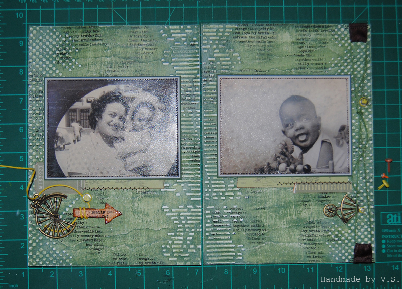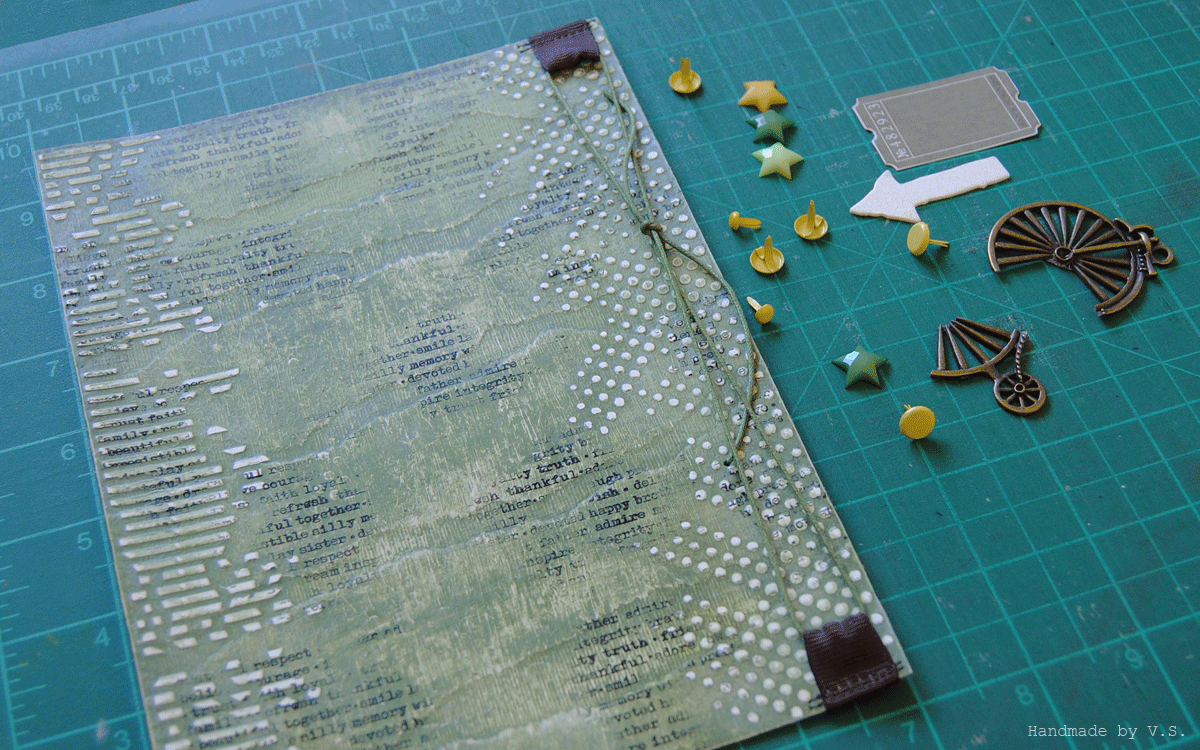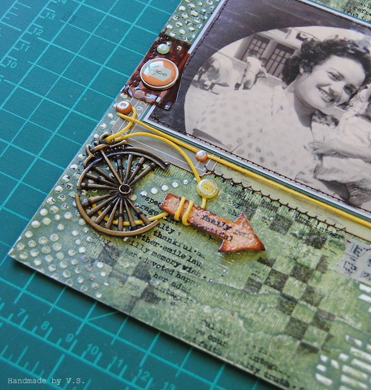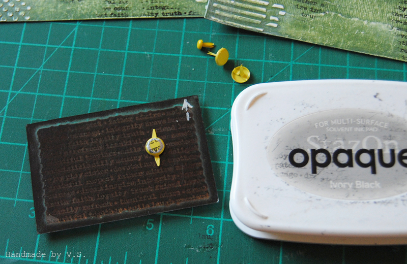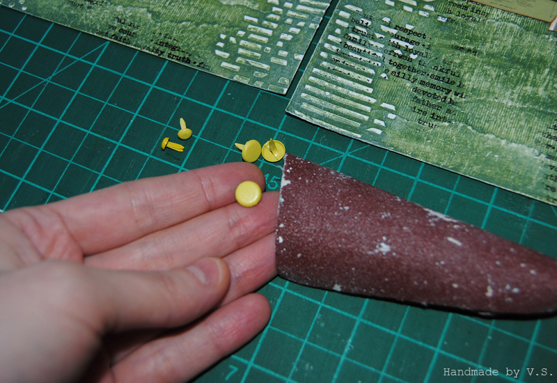 Вощёный шнур на стрелке продела в ушко шармика, закрепила брадсами и протянула под фото, уведя под страничку.
