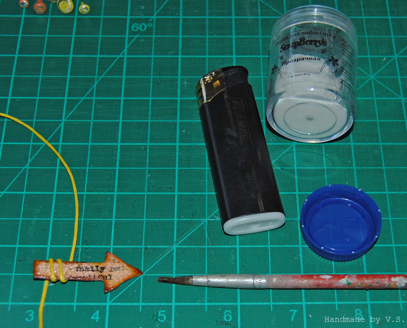 Нам понадобится маленькая кисть, немного воды, прозрачная пудра для эмбоссинга и зажигалка.