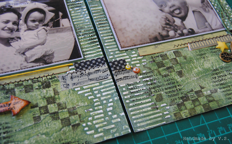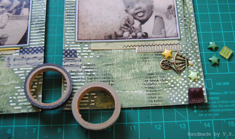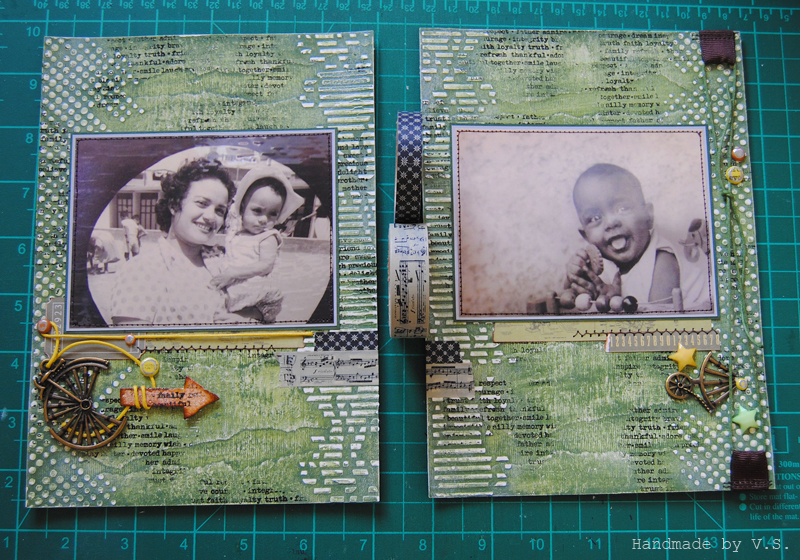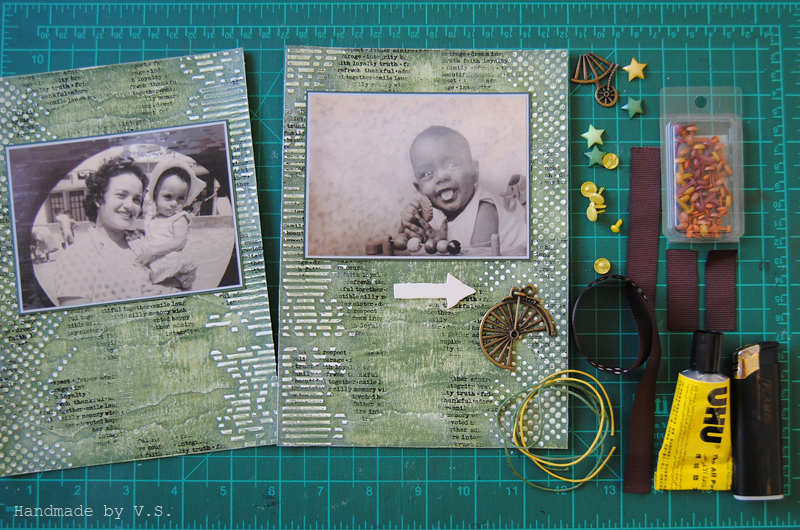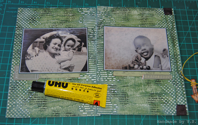 Чтобы усложнить странички, я подсовываю под фото кусочки скрап-бумаги (это