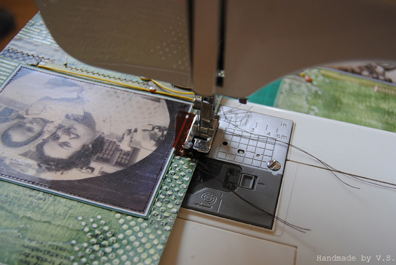 Я проложила шов зигзагом, усложняя бумажный декор - по одной строчке на каждой страничке. Это закрепит бумагу на краске, а контрастность нити уже само по себе декор.