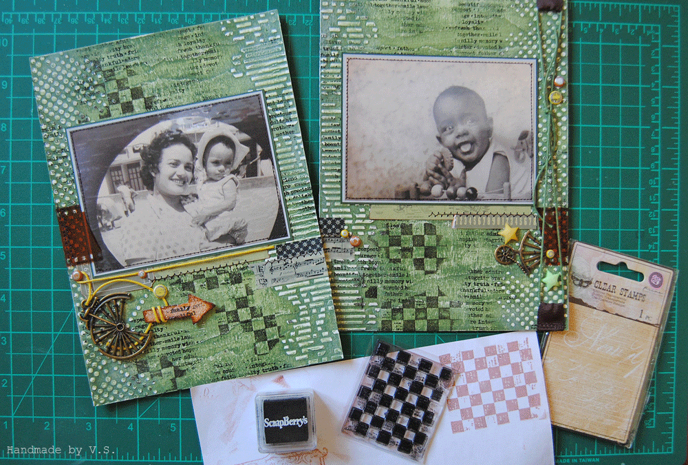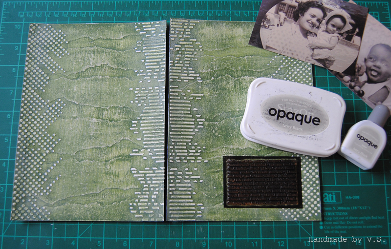 Странички показались мне пустыми, и я частично проштамповала их пигментными чернилами черного цвета при помощи штампа с квадратиками от Примы.