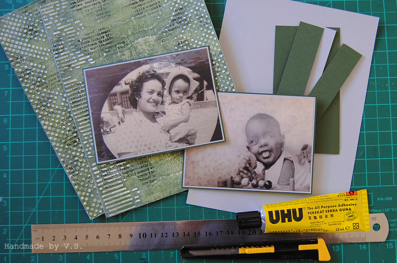Затем фото на серой подложке приклеиваем к темно-зелёному картону и точно так же обрезаем, оставляя по периметру по 1,5-2мм зелёного цвета.