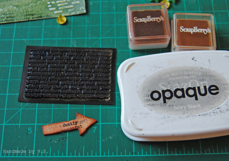 Штампуем стазоном одно из слов текстового штампа (я намеренно выбрала слово "семья"). Следите, чтобы на стрелочку не попало случайное слово (там в штампе есть и "любовь", и "милый", а есть и "глупый" - не хотелось бы прочесть такое, если ты получатель альбома))