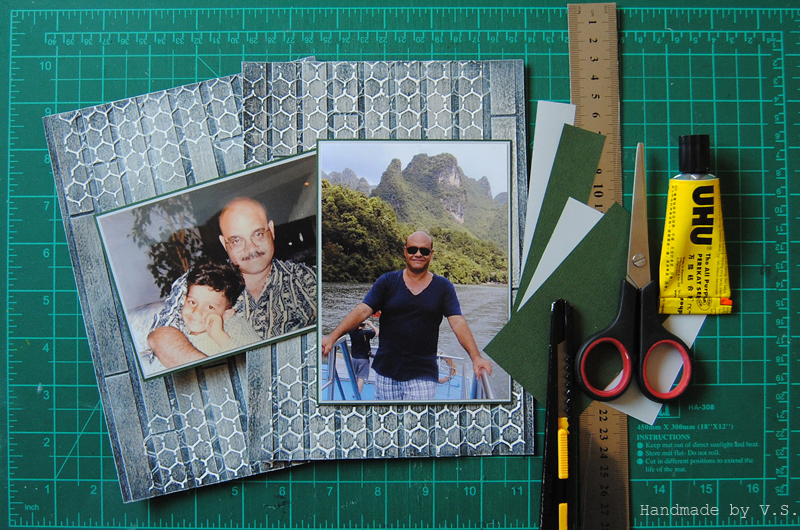 Для послденего разворота я беру тот же тёмно-зелёный картон, что и в первом, зелёном, развороте. Почему? потому что чёрная рамка вокруг любого фото - сами знаете что ))) а тут на моих фото есть зелень - какое-то деревце на первом фото и целая зелёная гора на втором.