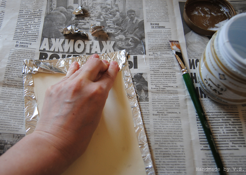 Проходимся пальчиками по всей поверхности фольги, прижимая фольгу к основе, формируя красивые складочки, создавая больше складочек там, где пусто ))
