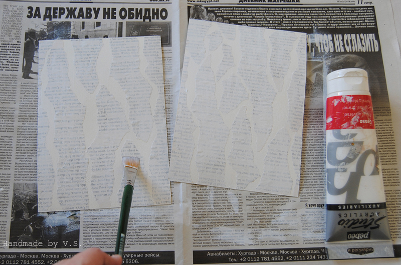 По всей поверхности загрунтовываем их тонким слоем гессо, водя кистью вдоль текстурных полосочек основы (в моём случае - строго вертикально) и тоже откладываем сушиться.