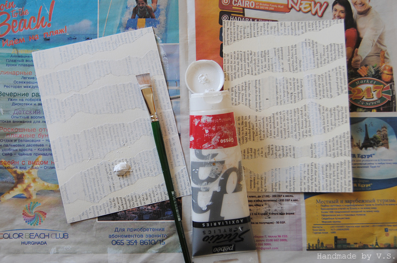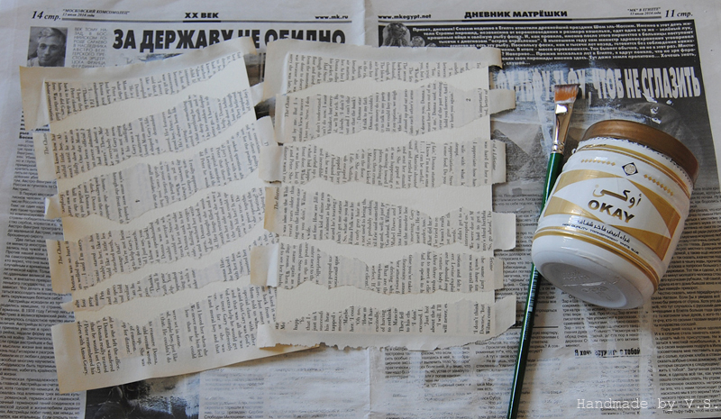 Теперь рвём книжные страницы на горизонтальные полосочки и приклеиваем на ПВА (клей ПВА должен быть белым, а при высыхании прозрачным - за то, как поведёт себя желтоватый клей, отвечать не могу).