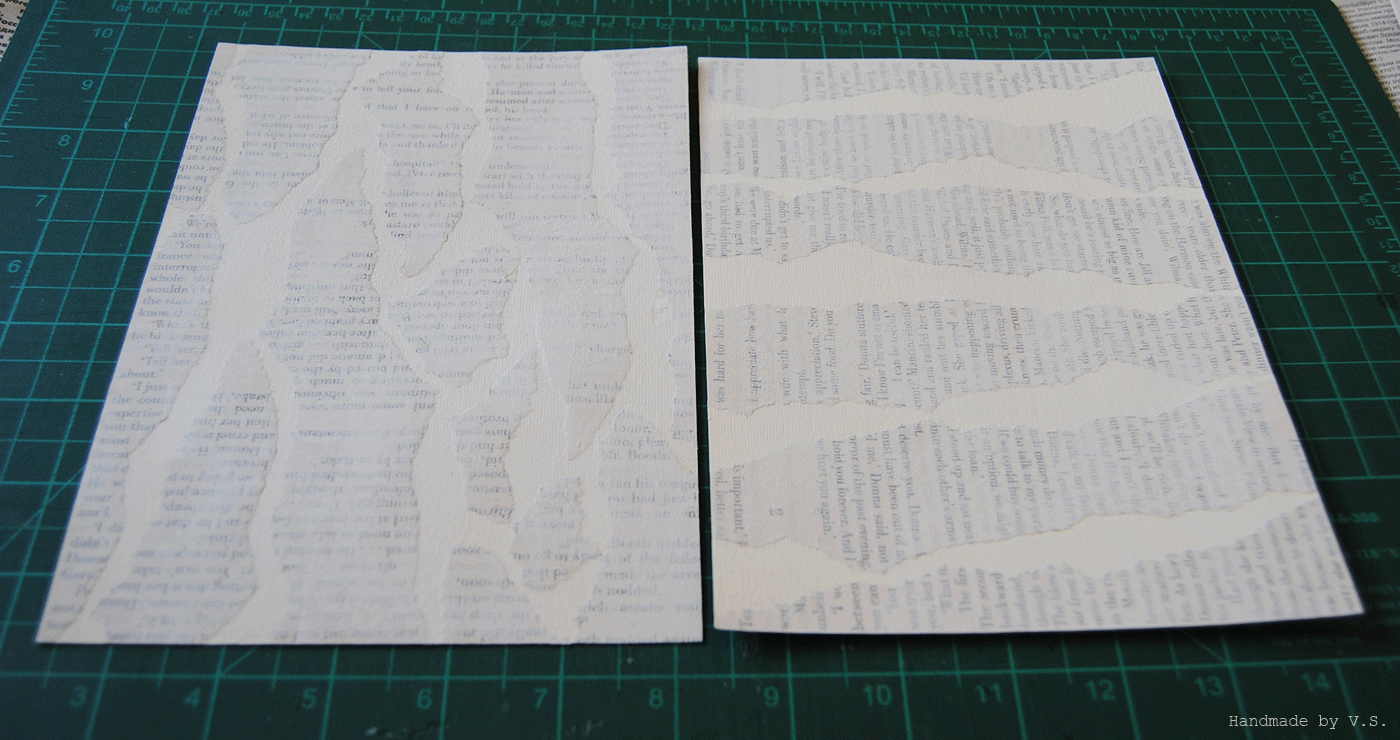 Переворачиваем странички лицом вниз и обрезаем торчащие за края части обрывков книжных страниц.